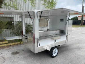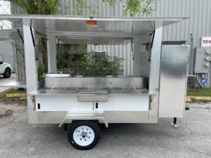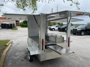 This 7ft x 4ft hot dog cart combines a compact, mobile design with high-quality construction and an efficient layout. Featuring a built-in sink, ample storage, and easy mobility, this cart is perfect for street vending and events. Its eye-catching exterior ensures maximum customer appeal and brand visibility.